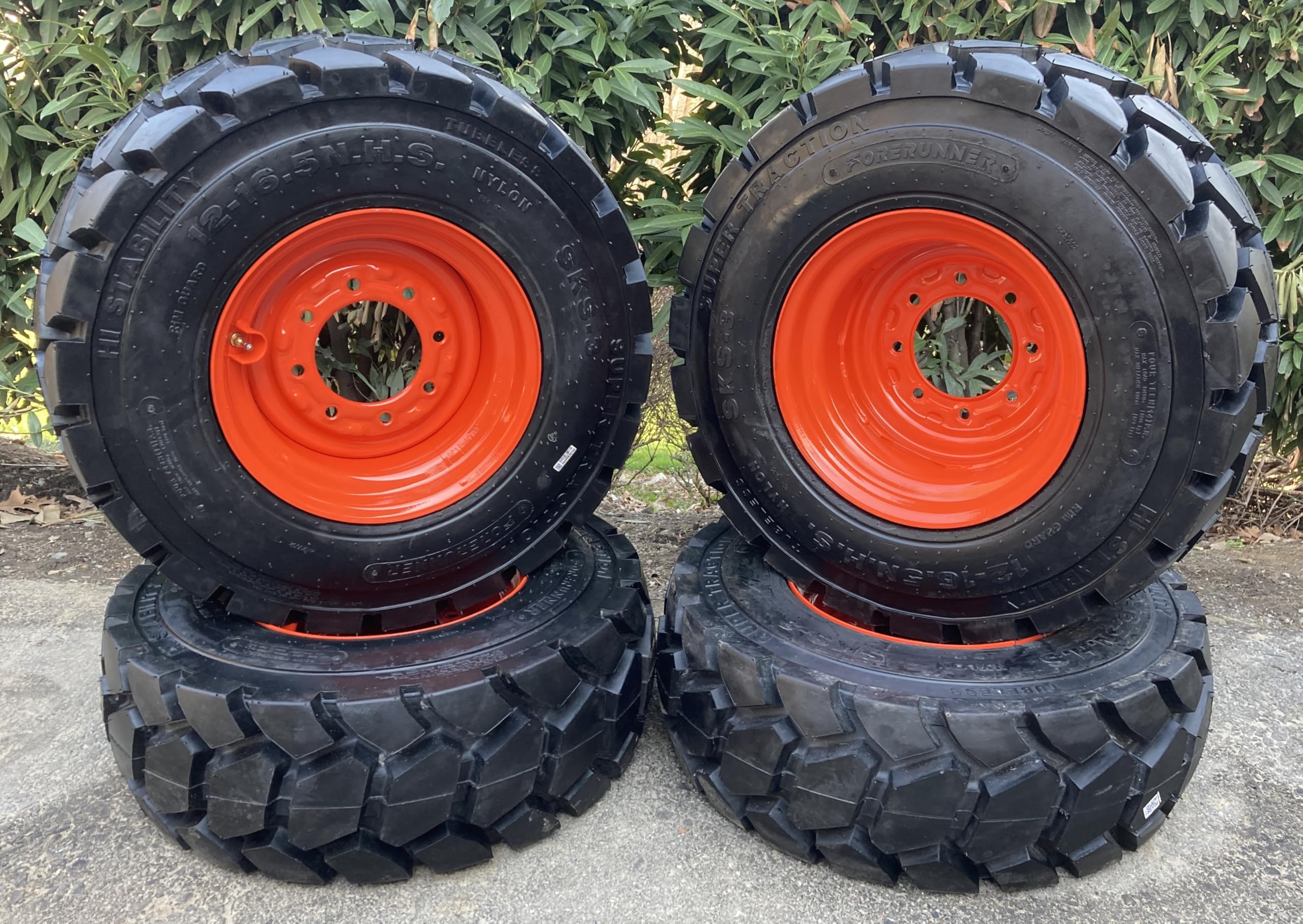 - (Singles or Set of 4) NEW Heavy Duty 12-16.5 Forerunner SKS-3 Industrial Skid Steer Tires mounted on 8 lug Wheels for Bobcat & more - 12X16.5 - 14 PLY. Ready to put on your machine & go!