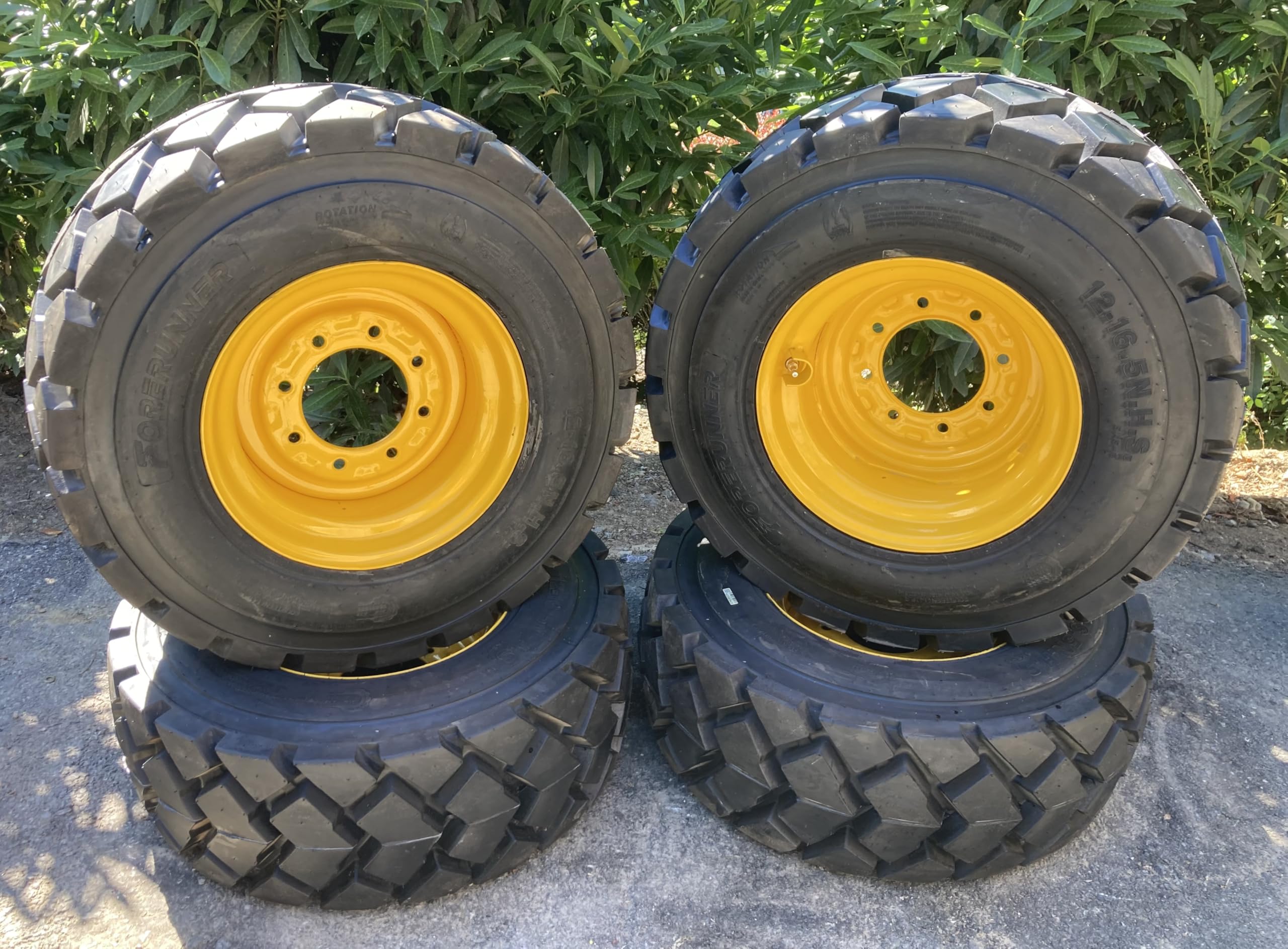 - FOAM FILLED (NO FLAT) Set of 4-Heavy Duty 12-16.5 Forerunner SKS-6 L5 Skid Steer Tires mounted on 8 lug Wheels for New Holland, John Deere & more- 12X16.5 - 14 PLY. Ready to put on your machine & go!